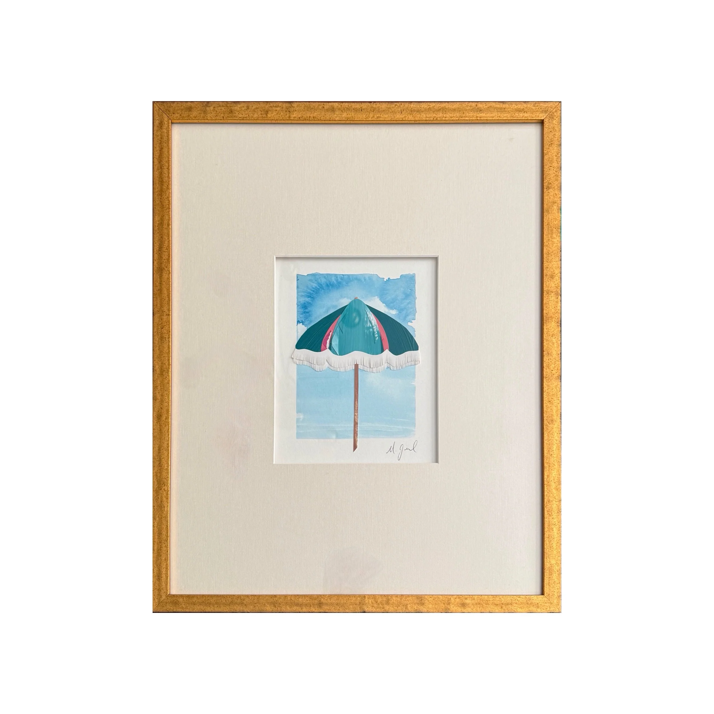 Watercolor and painted paper collage with hand cut fringe. Custom framed with gold face and black sides, finished to 16x20.