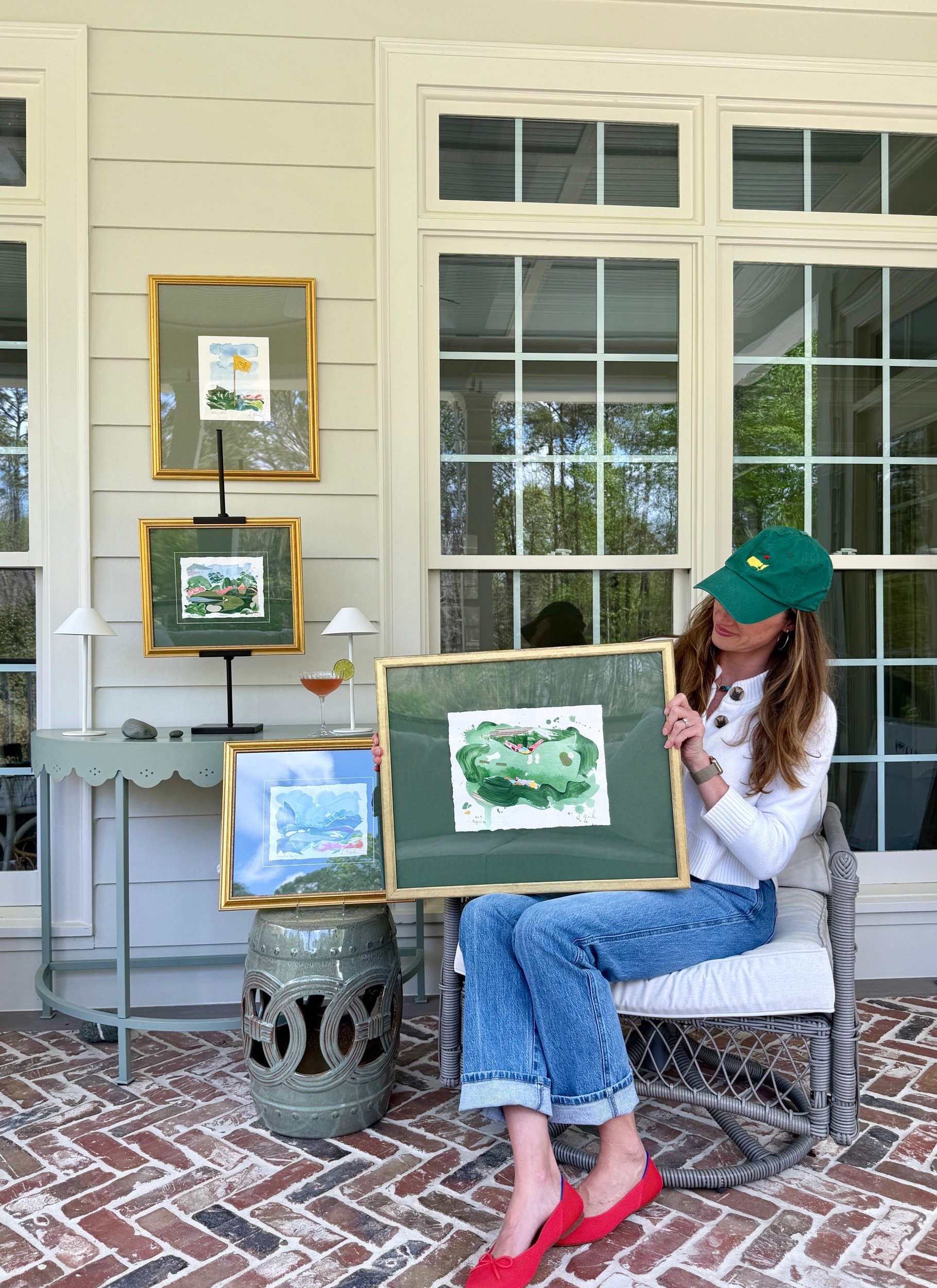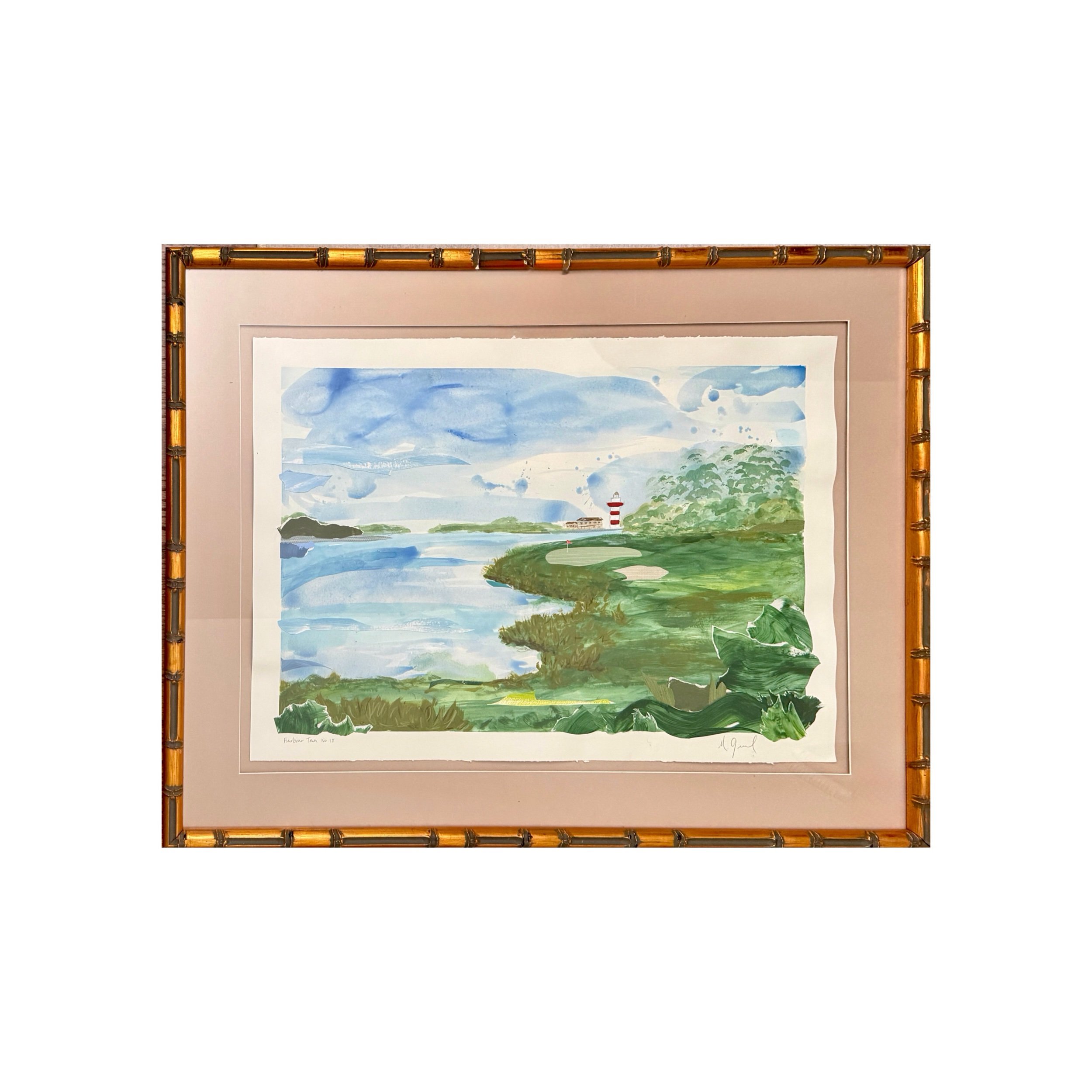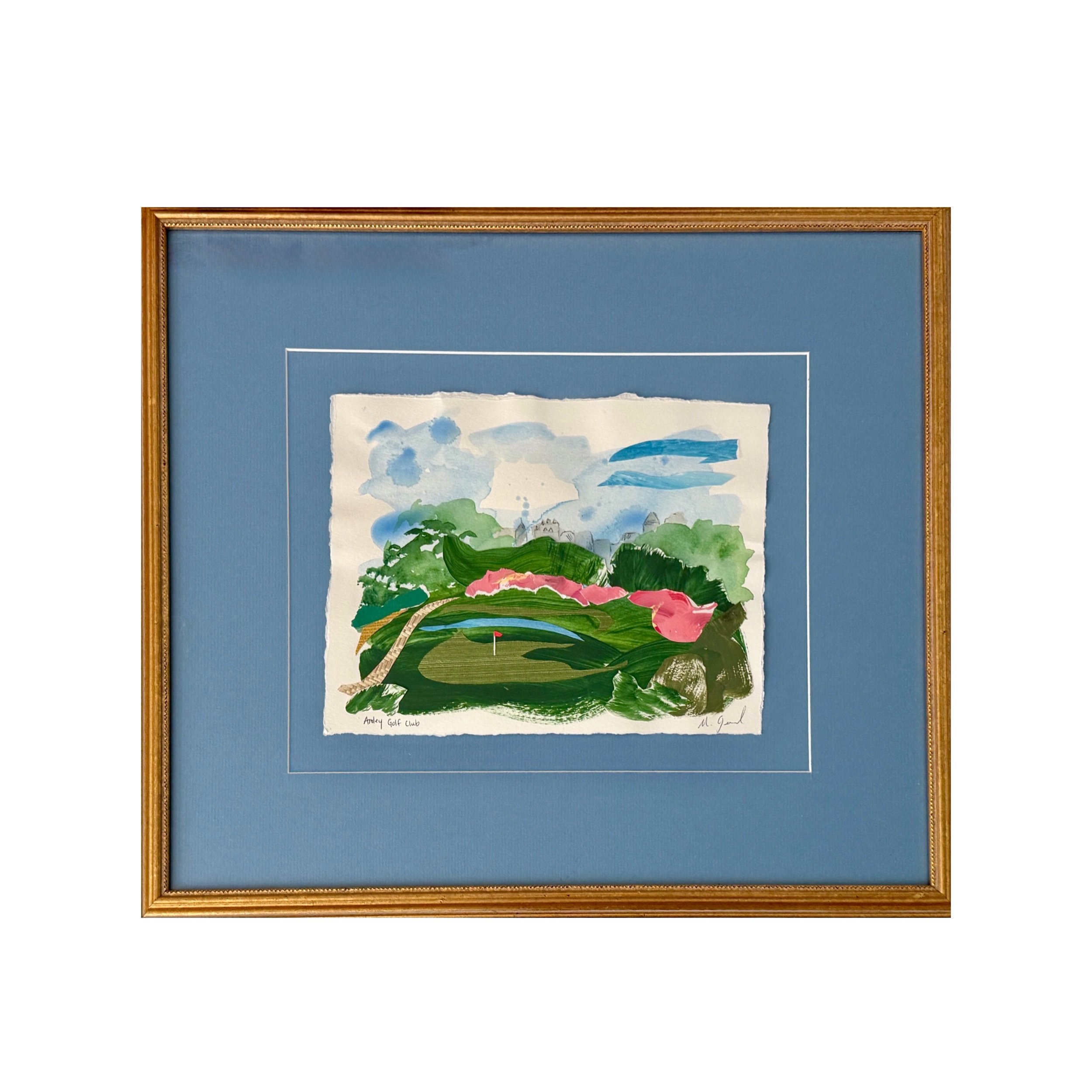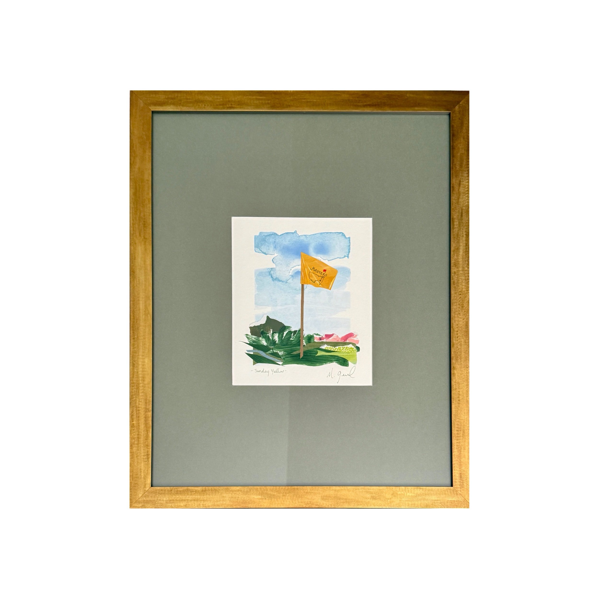 Watercolor and painted paper collage Masters flag from Augusta National. Custom framed with green mat and gold frame. Finished piece is 18x22.